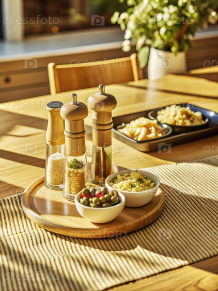 Три салфетки солью и перцем на деревянной подносе с маленькими блюдами еды на обеденном столе