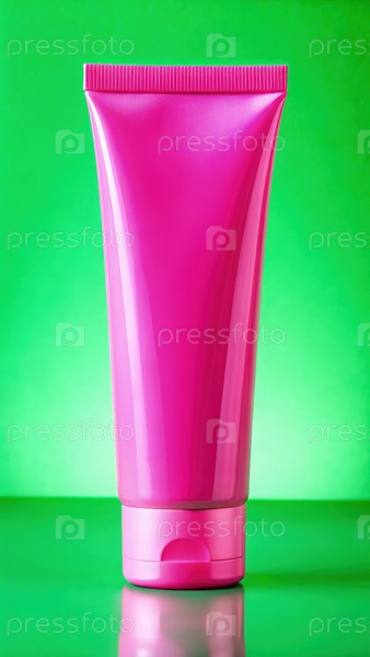 Розовая пластиковая трубка солнцезащитного крема на зеленом фоне
