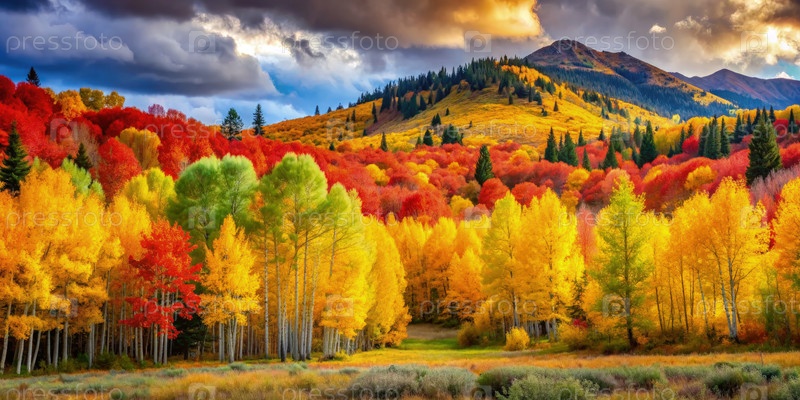 Красочный осенний пейзаж с горами и заходящими облаками