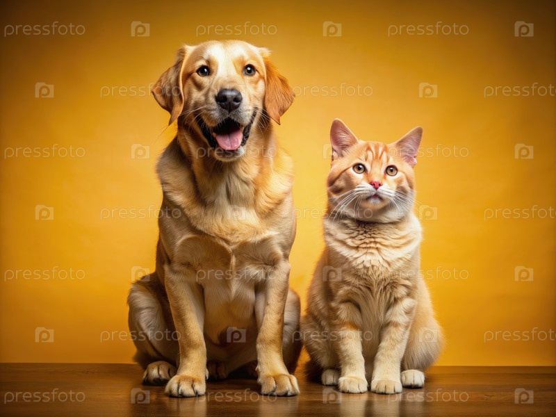 Золотой лабрадор ретривер собака вздыхает рядом с имбирным котом, сидящим на деревянном полу
