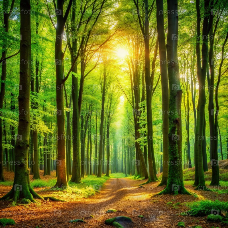 Солнечный путь через пышный зеленый лес во время Золотого часа
