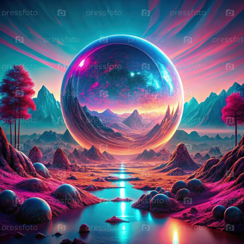 Фрактальный панковый пейзаж с гигантской отражающей сферой и розовыми деревьями