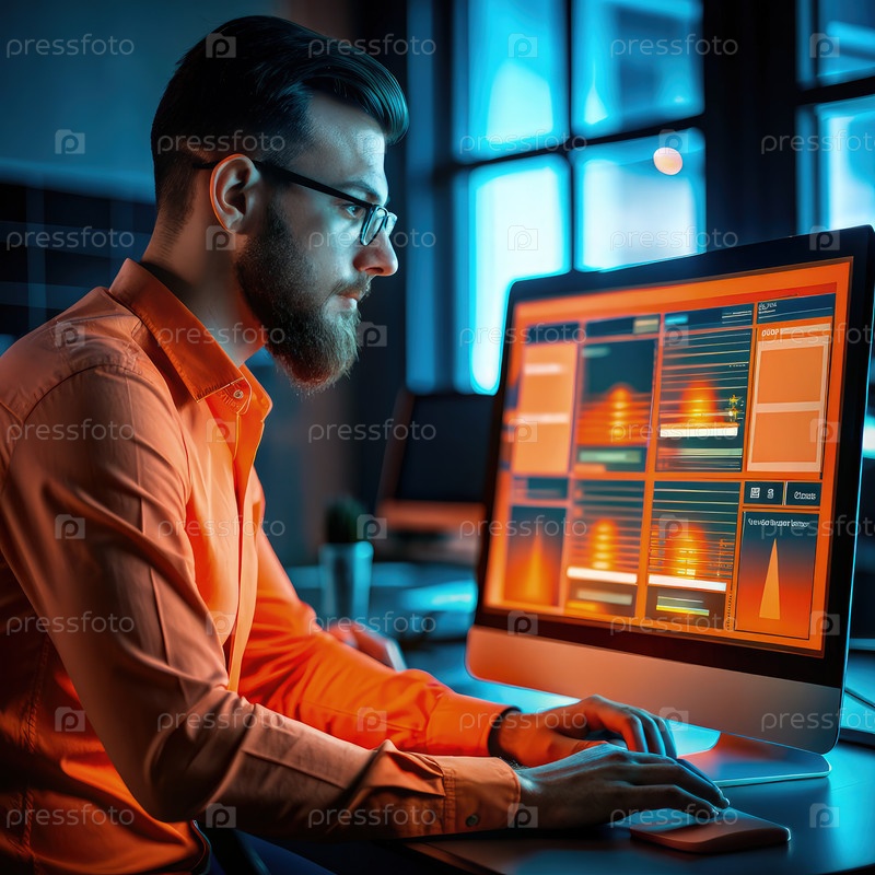Сосредоточенный веб-разработчик, работающий над дизайном сайтов ночью. генеративная ИИ