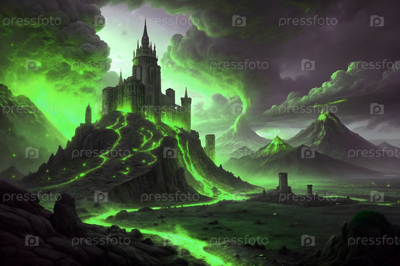 Фантастический замок на темном холме с извилистой дорогой, горами и светящимся огнем, драматической пейзажной сценой