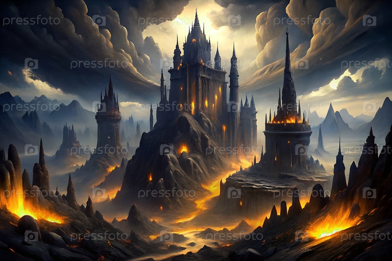 Фантастический замок на темном холме с извилистой дорогой, горами и светящимся огнем, драматической пейзажной сценой