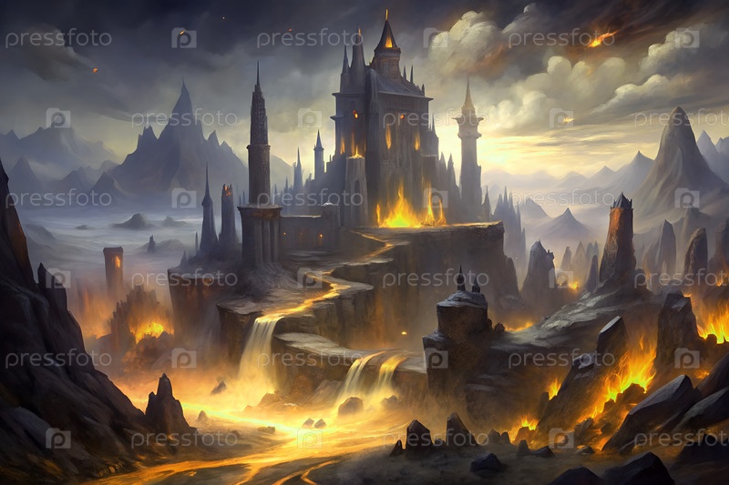 Фантастический замок на темном холме с извилистой дорогой, горами и светящимся огнем, драматической пейзажной сценой