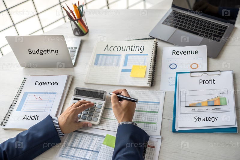 Бизнес-профессионал, анализирующий финансовые отчеты с помощью калькулятора и графиков на офисном столе