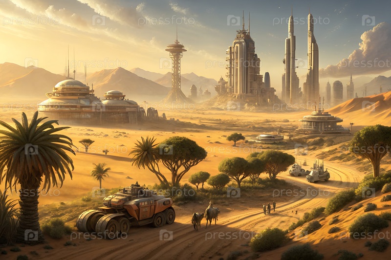 Футуристический научно-фантастический город на пустынной планете с передовыми башнями, машинами по уборке урожая и инопланетным пейзажем под несколькими лунами при закате солнца