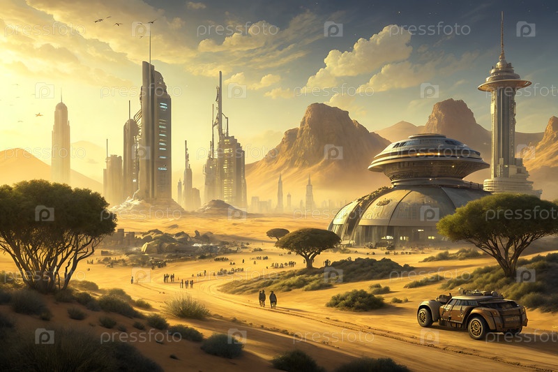 Футуристический научно-фантастический город на пустынной планете с передовыми башнями, машинами по уборке урожая и инопланетным пейзажем под несколькими лунами при закате солнца