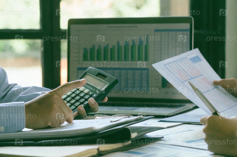 Бизнес-профессионал, анализирующий финансовые отчеты с помощью калькулятора и графиков на офисном столе