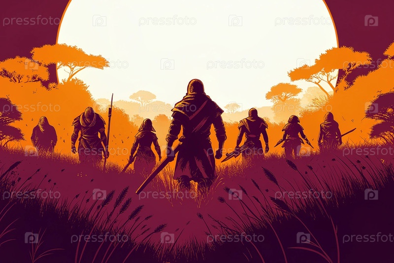 Эпические фэнтезийные боевые силуэты воинов, сражающихся с гигантским демоном под огромным полнолунием в туманной ночной битве