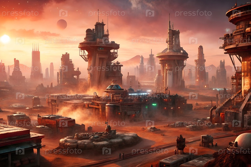 Футуристический научно-фантастический город на пустынной планете с передовыми башнями, машинами по уборке урожая и инопланетным пейзажем под несколькими лунами при закате солнца