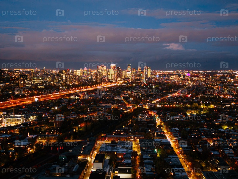 Ночной вид аэропорта Turcot Interchange в Монреале со светящимися шоссе и городскими огнями во время драматического синего часа