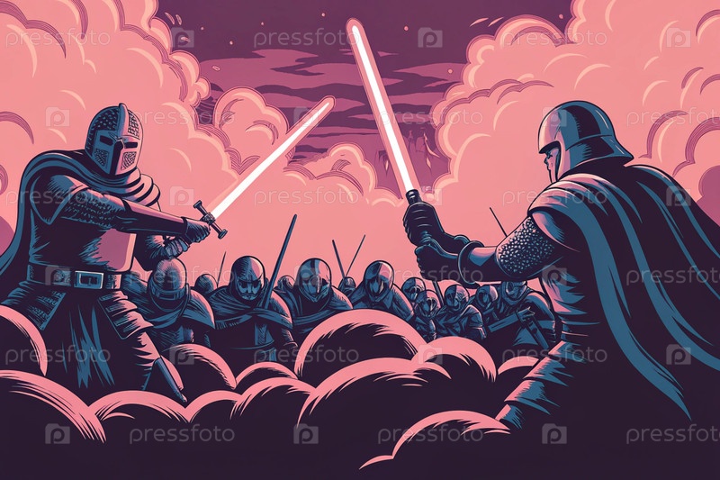 Эпическая фэнтези-сцена битвы с воинами, монстрами и молниеносом в драматическом горном пейзаже
