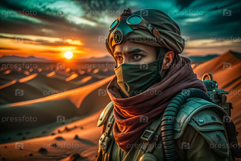 Одинокий футуристический пустынный воин, стоящий на песчаных дюнах в драматическом пейзаже захода солнца