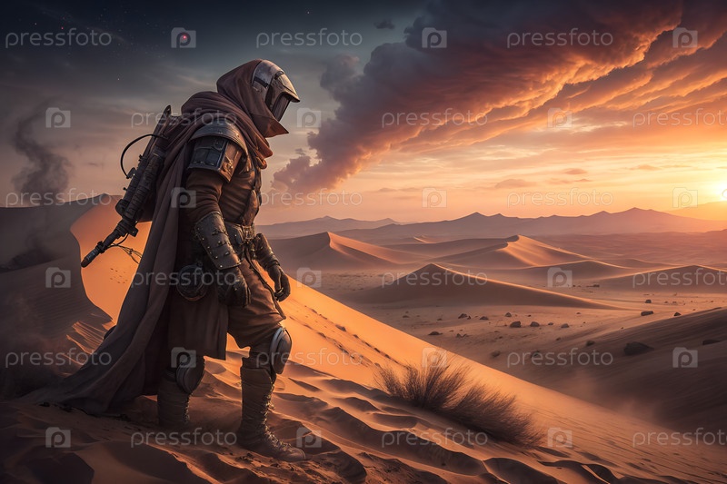 Одинокий футуристический пустынный воин, стоящий на песчаных дюнах в драматическом пейзаже заката солнца, научно-фантастический кочевник, исследующий Сахару