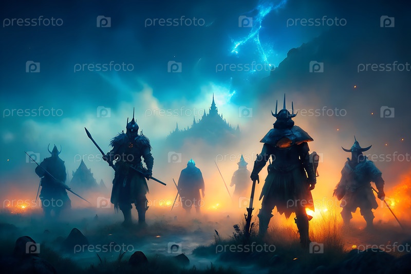 Эпические фэнтезийные боевые силуэты воинов, сражающихся с гигантским демоном под огромным полнолунием в туманной ночной битве