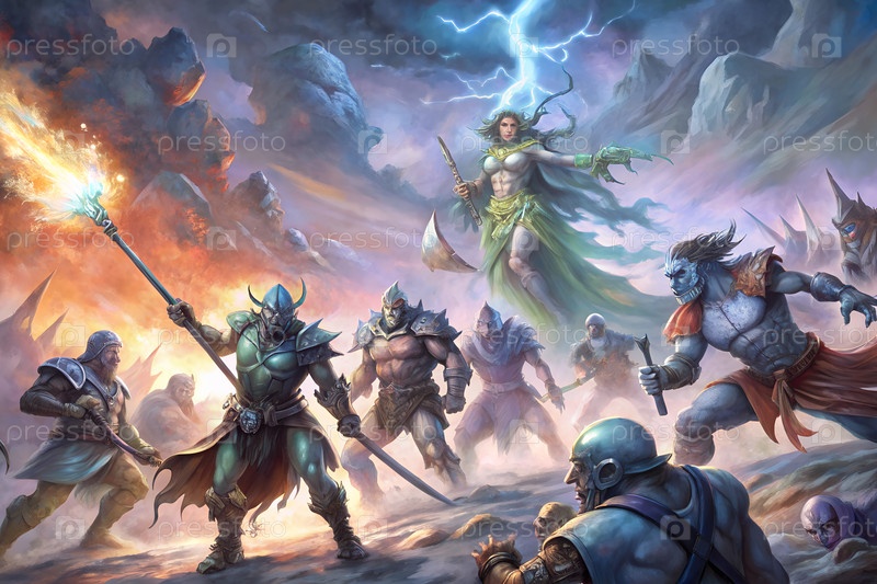 Эпическая фэнтези-сцена битвы с воинами, монстрами и молниеносом в драматическом горном пейзаже