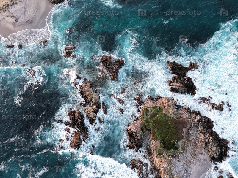Вид с воздуха скалистой береговой линии с бирюзовыми волнами, разбивающимися вблизи Монтерея Калифорния США