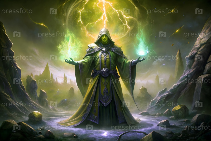 Фантастический маг, бросающий магию огня и льда в темном мистическом пейзаже с светящейся энергией и руинами