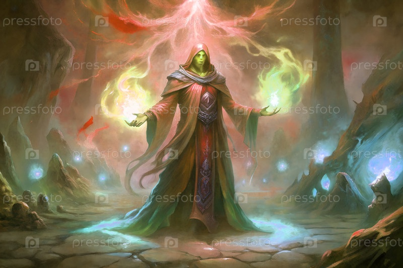 Фантастический маг, бросающий магию огня и льда в темном мистическом пейзаже с светящейся энергией и руинами