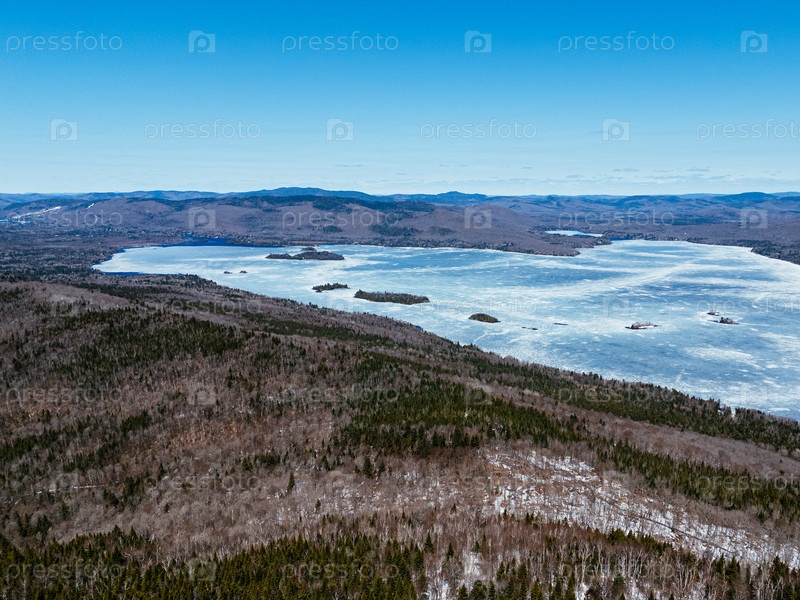 Вид с воздуха замерзшего озера в Квебеке с лесом и горами под синим небом