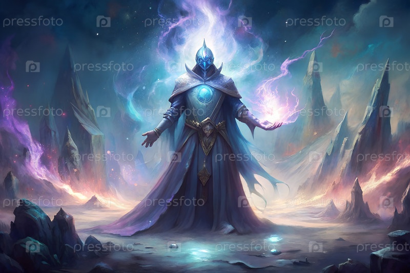 Фантастический маг, бросающий магию огня и льда в темном мистическом пейзаже с светящейся энергией и руинами