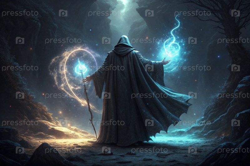 Фантастический маг, бросающий магию огня и льда в темном мистическом пейзаже с светящейся энергией и руинами