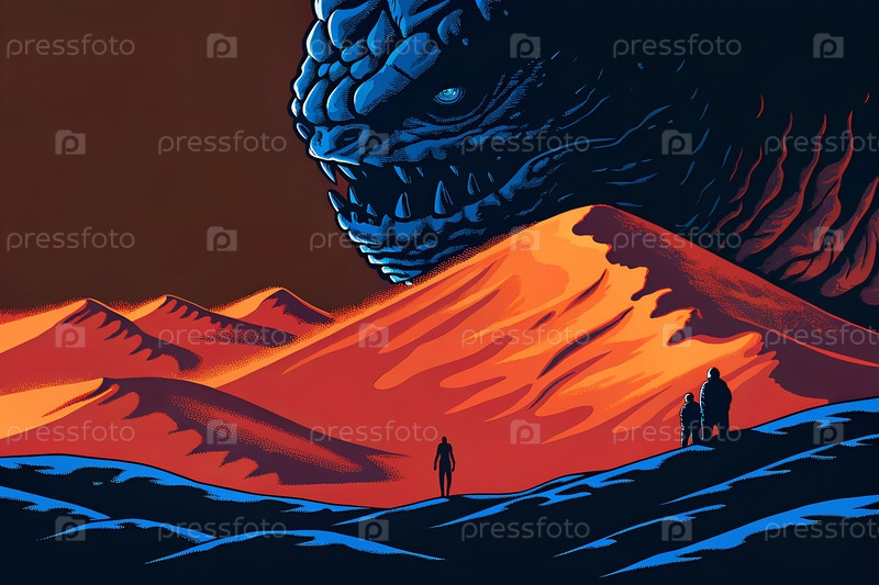 Эпическое гигантское пустынное существо, поднимающееся с песчаных дюн в то время как одинокий путешественник приближается к огромному кинематографическому ландшафту фантазии