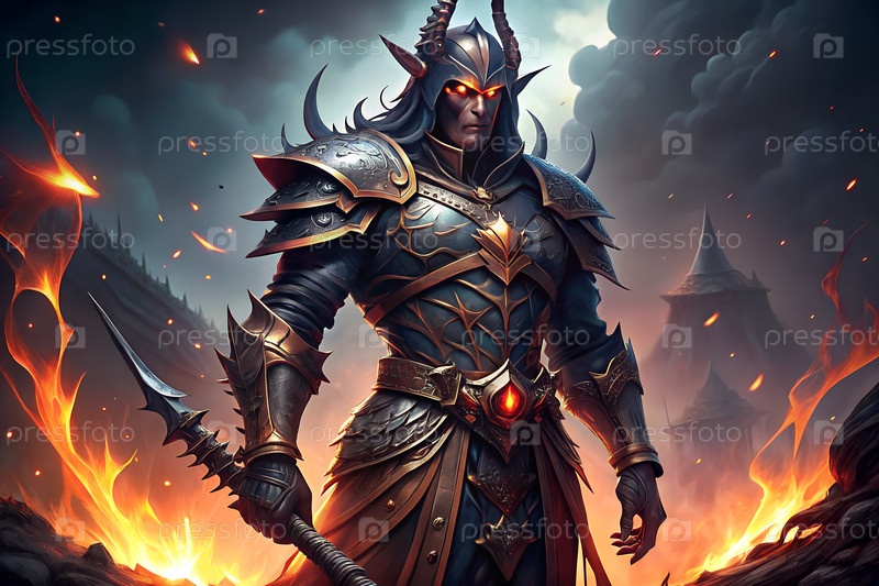 Эпический воин-темный эльф со светящимся волшебным посохом на мистическом поле битвы, кинематографический персонаж фантазии в доспехах. g