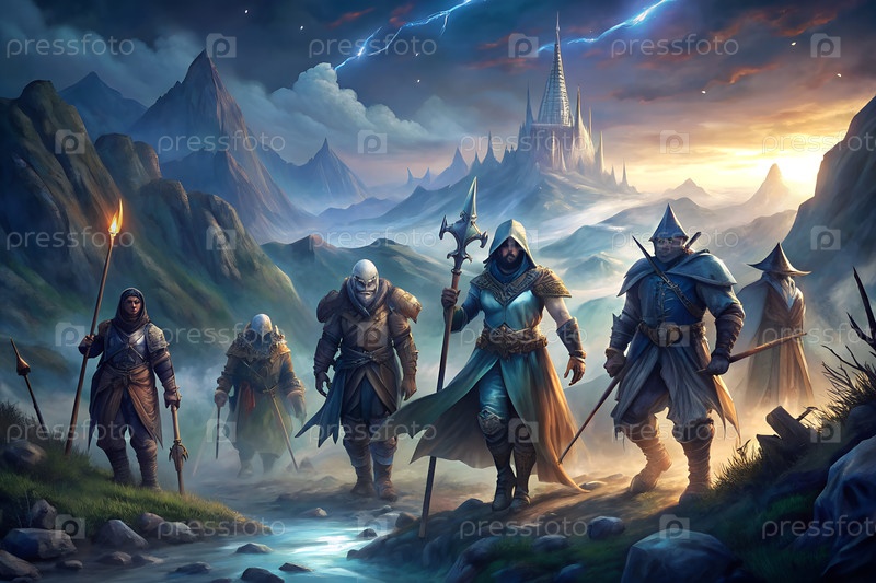 Группа фантастических приключенцев с видом на обширную горную долину и реку при восходе солнца, эпическое путешествие пейзажной сцены. g