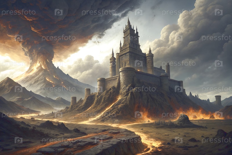 Фантастический замок на темном холме с извилистой дорогой, горами и светящимся огнем, драматической пейзажной сценой