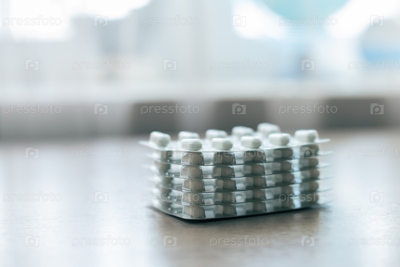Таблетки, медикаменты, обезболивающие на деревянном столе