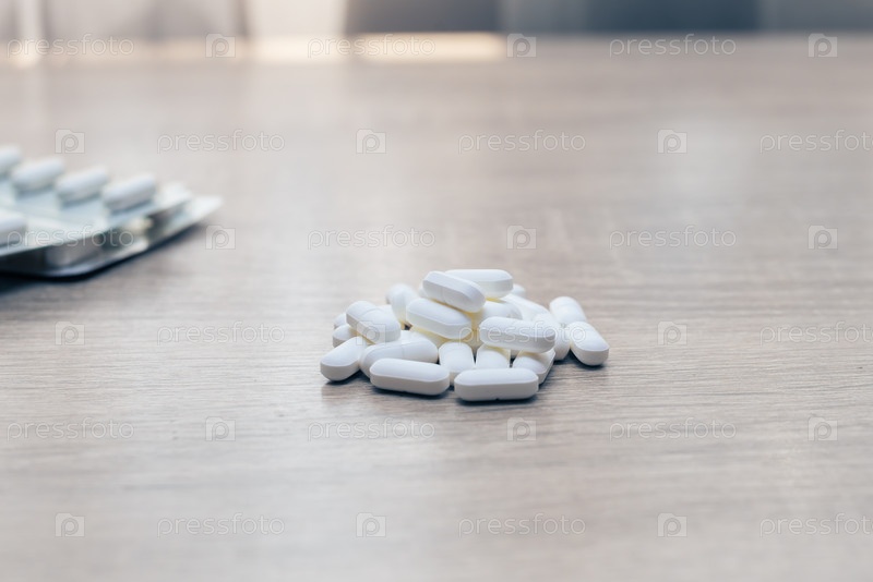 Таблетки, медикаменты, обезболивающие на деревянном столе