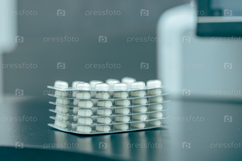 Блистерная упаковка с таблетками на столе в медицинском помещении