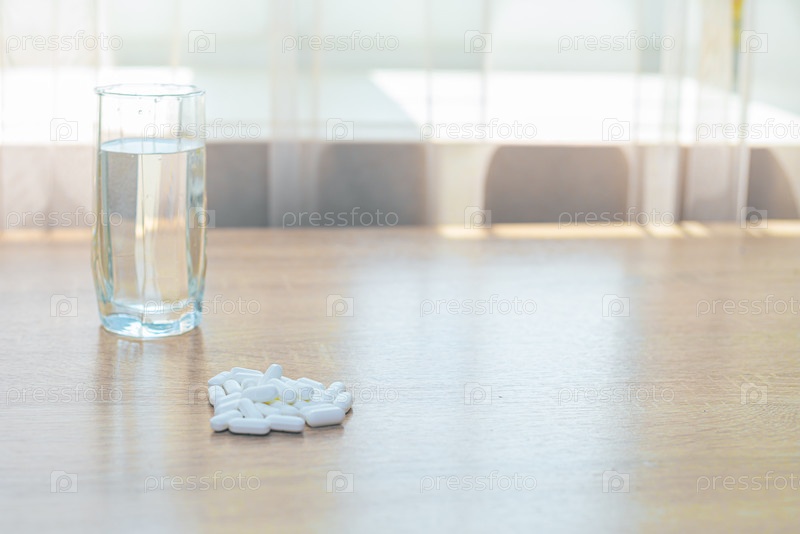 Таблетки, медикаменты и стакан воды на деревянном столе