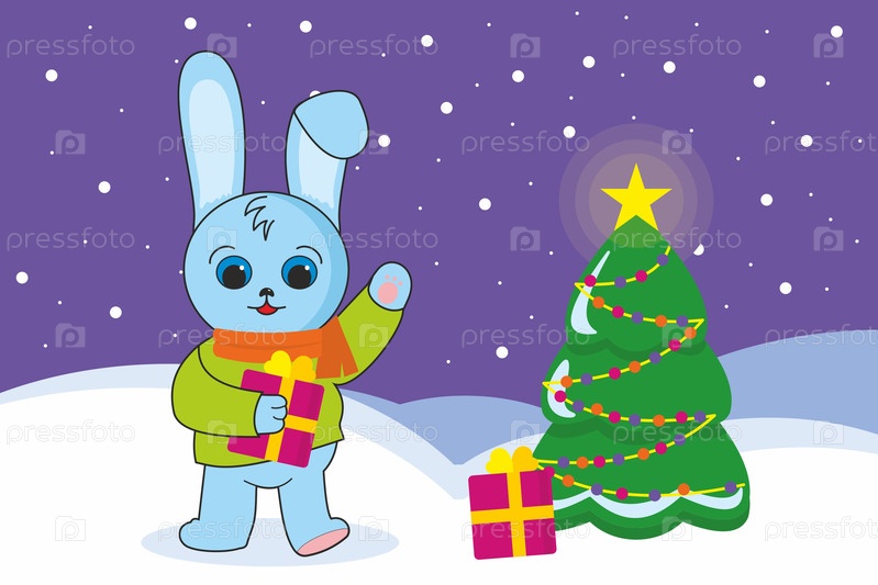 Снеговик, кролик и Санта-Клаус возле рождественской елки