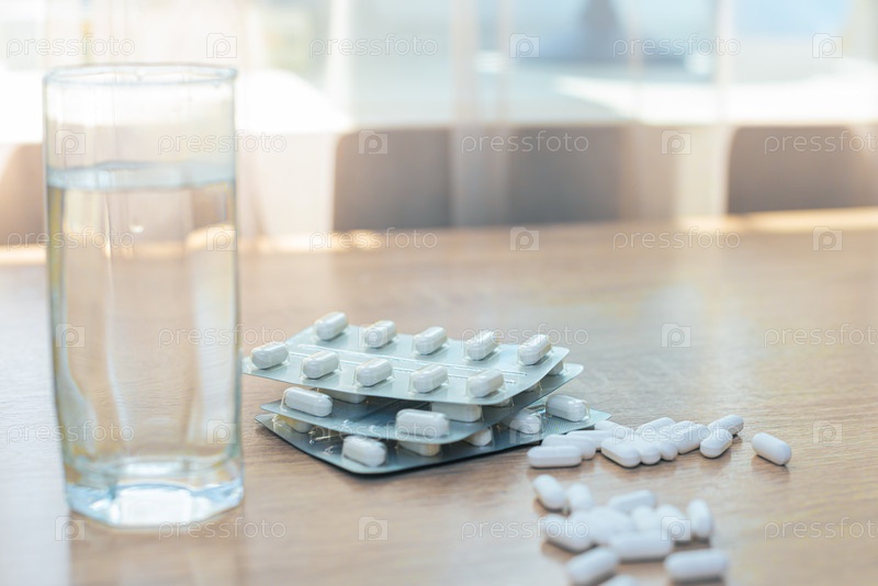 Таблетки, медикаменты и стакан воды на деревянном столе