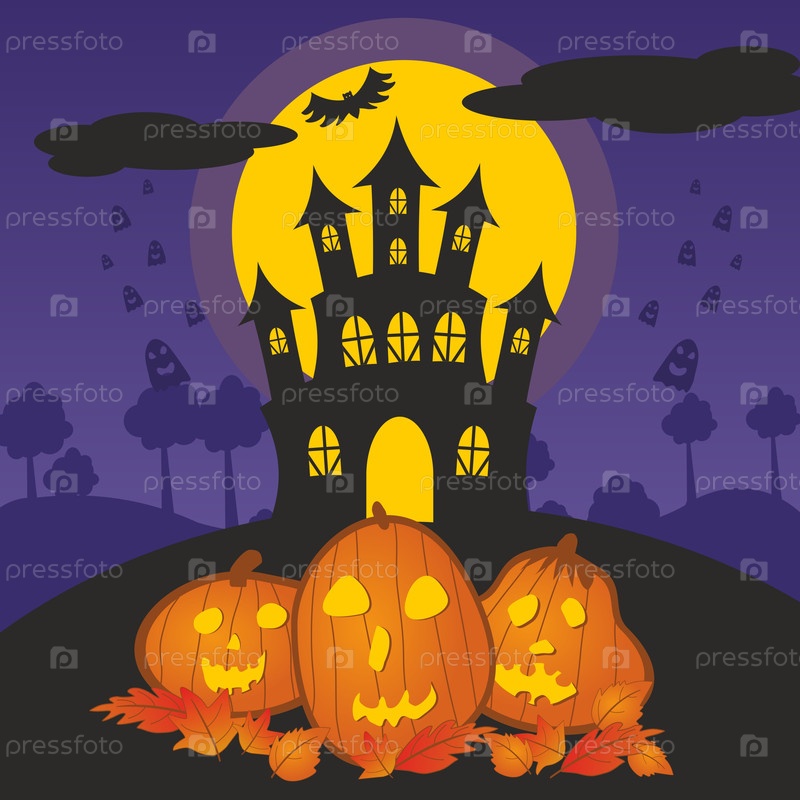 Ночь Хэллоуина. Летучие мыши, привидения и большая луна над кладбищем