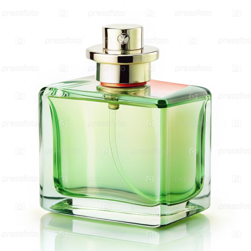 Бутылка зеленого парфюма с серебряным распылителем на белом фоне