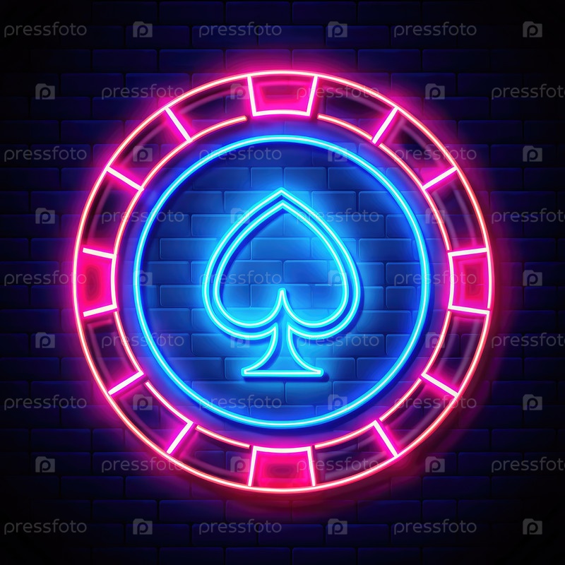 Neon Spades Poker Chip Sign на кирпичной стене. генеративный ИИ