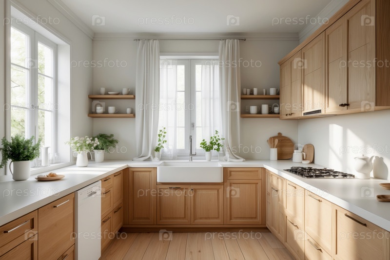 Современный стильный модный кухонный интерьер с легкой деревянной мебелью и бытовыми принадлежностями AI Generative