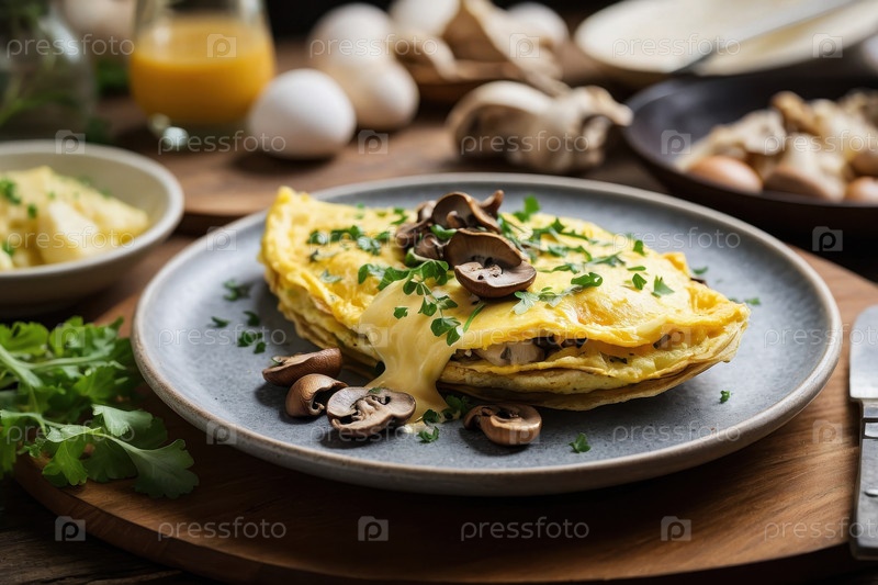 ИИ генеративные яйца французского омлета с грибами и сыром, вкусная традиционная кулинарная бранч-кухня