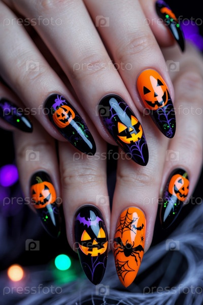 Тематический осенний маникюр ярких цветов черный и фиолетовый с праздничными узорами Хэллоуин AI Generative