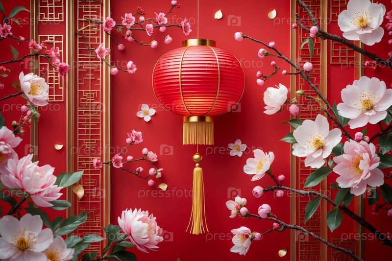 AI Generative Background Традиционные китайские символы Нового года с фонарями и вишневыми ветвями
