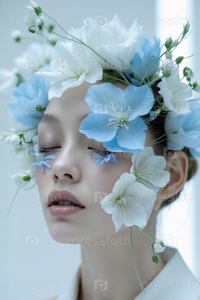 ИИ генеративный портрет молодой женщины естественно чистый помада макияж, модель моды Красота в цветах