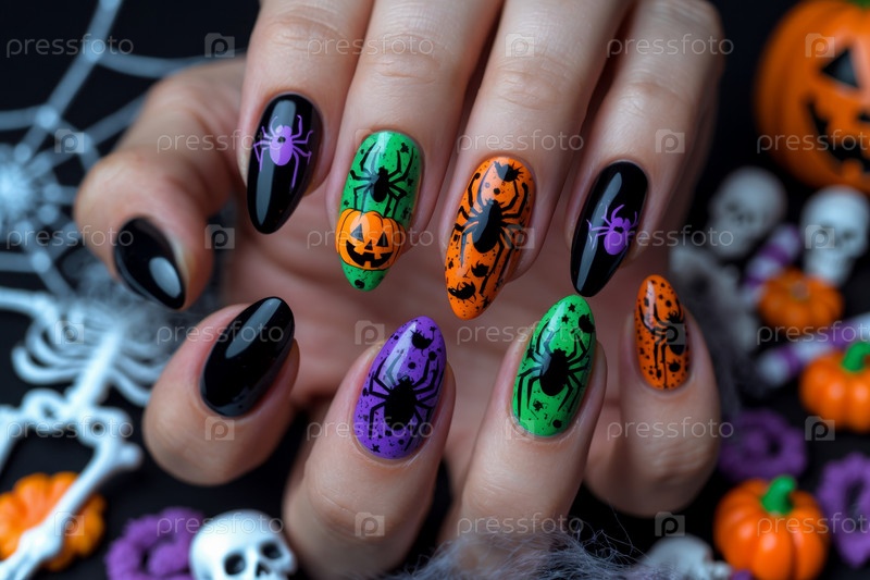 Тематический осенний маникюр ярких цветов черный и фиолетовый с праздничными узорами Хэллоуин AI Generative