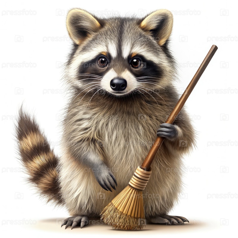 Раккун держит в руках метлу для уборки