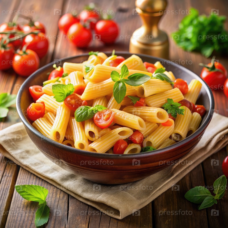 Паста Penne с вишневыми помидорами и базиликом в деревенской миске