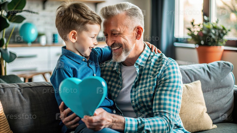 Молодой мальчик преподносит подарок в форме сердца своему отцу на диване